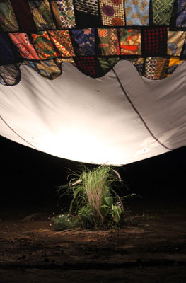 Cette structure en tissu est suspendue au-dessus d’un sol en terre glaise rouge. On retrouve sur les pentes du Kilimandjaro une terre de couleur identique. Tous les jours un seau de glace est déversé dans le creux de cette demi-sphère. La glace fond petit à petit est goutte au travers du tissu au milieu du disque de terre.  A cet endroit des plantes se développent formant comme une oasis. Au-delà, la glaise se fissure progressivement suggérant l'idée d'une désertification.