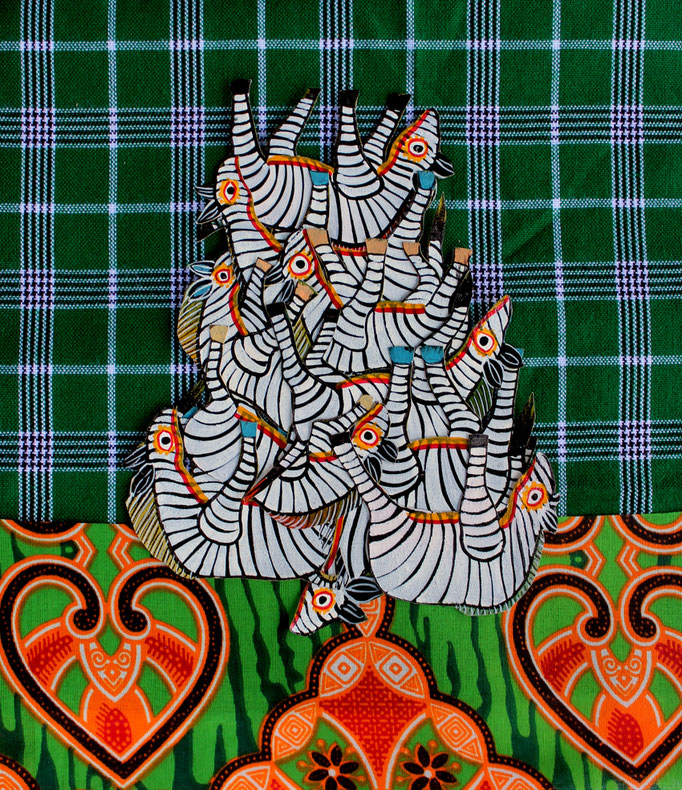 Collage sur tissus traditionnels, dim. 32cm x 30cm, 2016