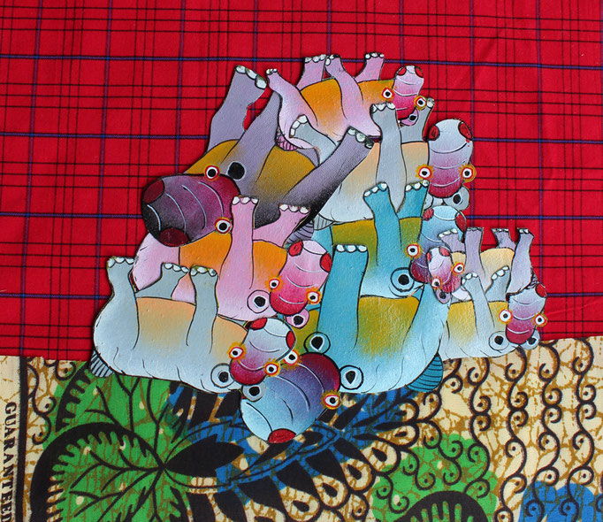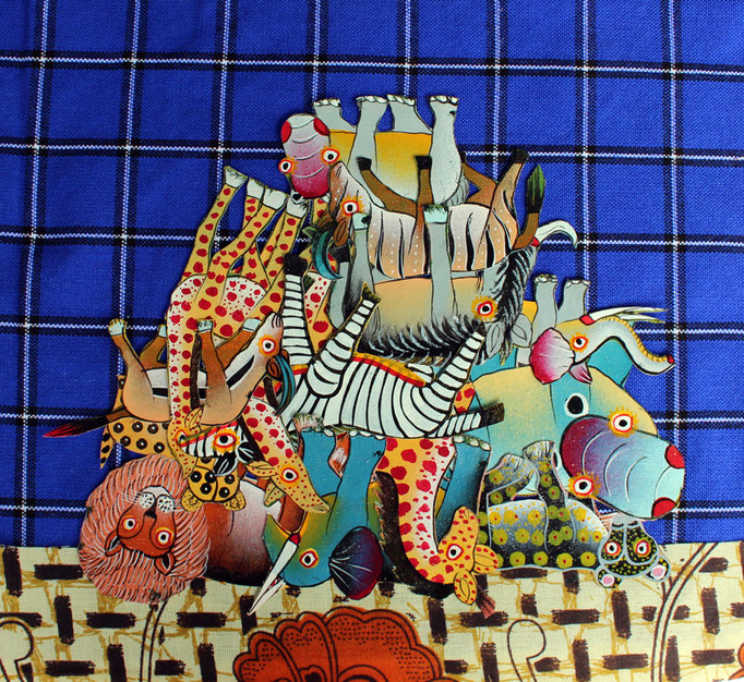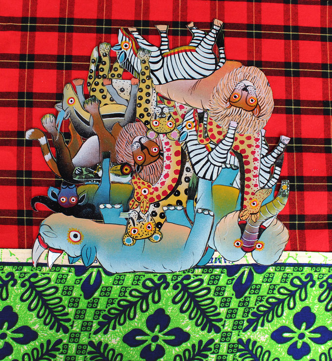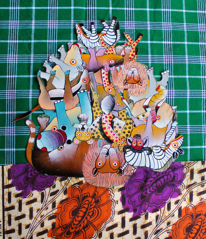 Toujours sur la thématique de la résidence d'artiste "changements climatiques et répercussions sur l'environnement local" j'ai commencé la réalisation de collages. L'idée est de représenter sur des tissus traditionnels tanzaniens (kitengue, maassaï shuka...) des Kilimandjaro d'animaux en tas. Ces animaux sont issus de toiles de style tingatinga que j'achète sur les marchés touristiques d'Arusha (Maassaï Market...) et que je découpe. Ce travail est en réaction directe avec la violence de ce "copié - collé" quasi industriel de ce style pictural, vidé de sa substance poétique originelle, sans aucun renouveau, pour n'être plus qu'un produit touristique qui a perdu tout sens !