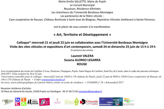 Développement». Il s’agit de proposer, sur plusieurs sites, une rencontre du patrimoine viticole et de l’art contemporain, en associant les différents acteurs locaux. Les chercheurs de l’Université Bordeaux Montaigne, de nombreuses personnalités et acteurs du territoire Castillon/Pujols, les artistes et le public sont conviés à participer à cette manifestation ponctuée de temps d’échanges, de contributions éclairées, d’expositions créatives et de visites des sites viticoles.