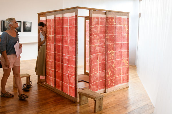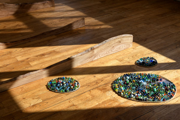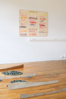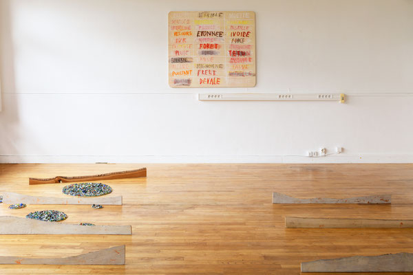 Les deux salles seront abordées comme contrastées et complémentaires. La première est marquée par des installations, invitant à se déplacer entre des sculptures, sentir son propre pas. La seconde