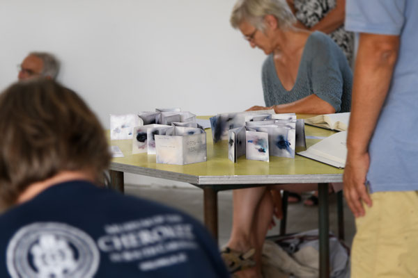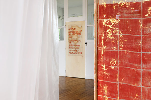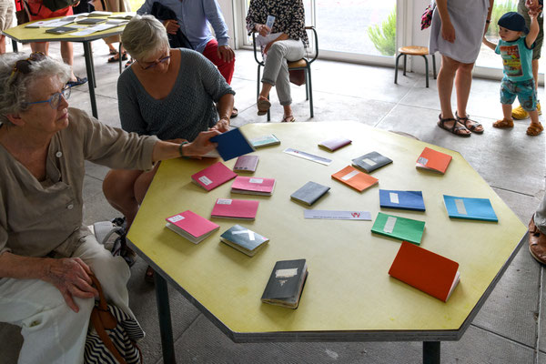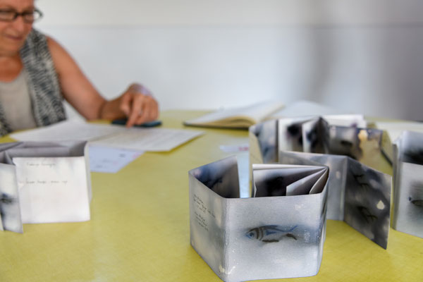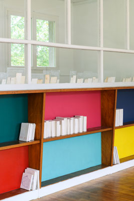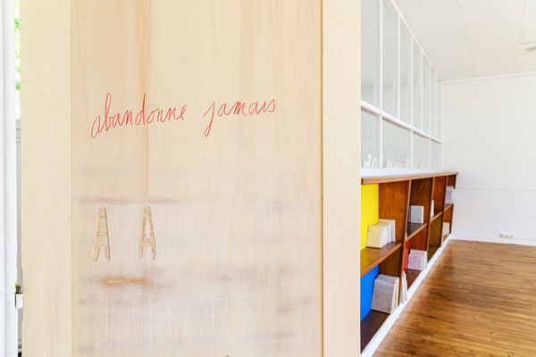 Le préau, qui accueille en premier, est un espace de réserve, chambre d’échos, de documents. Une présentation de livres, carnets, notes d’artistes, souligne cette pratique et dimension du cahier,