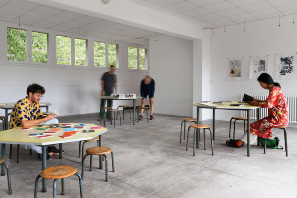 communauté d’une salle de classe à l’autre. Dans le préau, transformé en cabinet de recherches, ils invitent à leur tour quatre artistes - Mirsad Jazic, Inès Lavialle, OCTO, Frédérique Soumagne -
