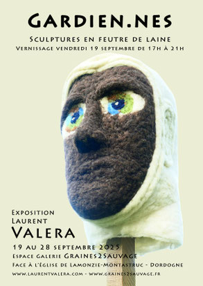 Exposition personnelle des sculptures en feutre de laine Gardien.nes de Laurent Valera du 19 au 28 septembre 2025 à l'Espace Galerie Graines2Sauvage à Lamonzie-Montastruc.