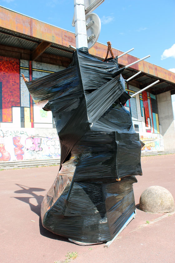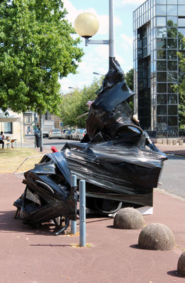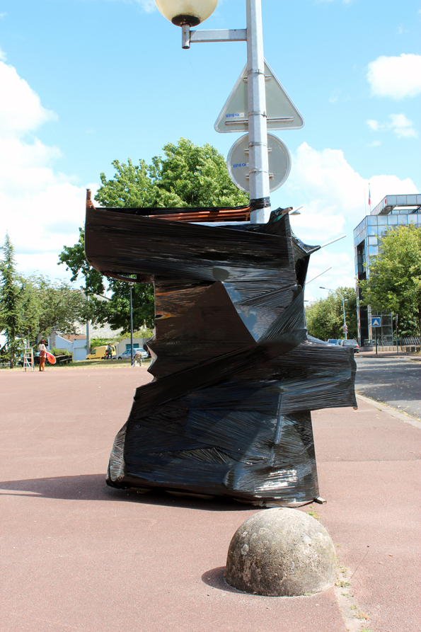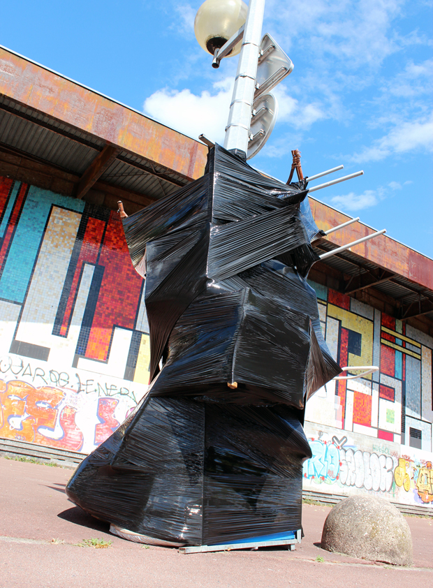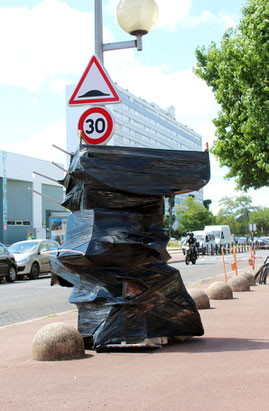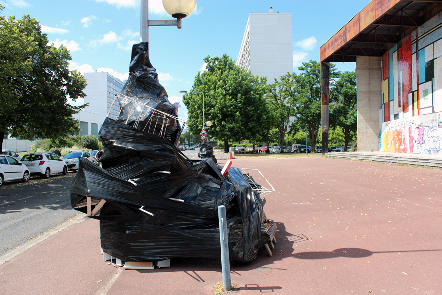 Les lampadaires de la place de la salle des fêtes du grand parc sont habillés d’étranges formes noires de plastique brillant, hautes et volumineuses. En s’approchant elles laissent deviner la nature des éléments qu’elles abritent : objets du quotidien, déchets de construction… Egalement, par l’effet miroir du drapé de plastique elles jouent avec l’environnement du quartier, distordant une réalité très rectiligne. Finalement elles semblent en mouvement, telles de grands volumes de bitume fondant au soleil, s’écrasant sous leur propre poids d’objets, de rejets, d’encombrants de notre vie. Trous noirs d’une humanité hors-sol.