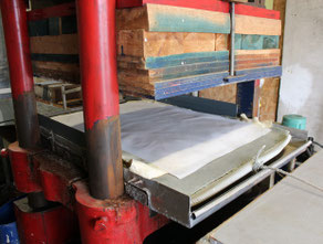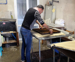 Réalisation d'une série de 16 feuilles de papier à base de pâte à papier chiffon (lin, chanvre et coton) avec l'expertise de Frédéric Gironde à l'atelier Ruscombe Paper Mill à Margaux dans le médoc.