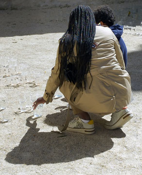 Cette action s'apparente pour l'artiste à la création d'un rite qui inclut les quatre éléments : l'eau, la terre (les verres sont déposés sur le sol), le feu (l'éclairage) et l'air (qui activera la dynamique des reflets en créant des ondes sur l'eau des verres et du coup sur leur reflet). C'est une manière forte, simple et singulière de se réunir pour manifester d'une communauté reliée d'un soin et d'une attention respectueuse à cet élément primordiale à la vie qu'est l'eau.