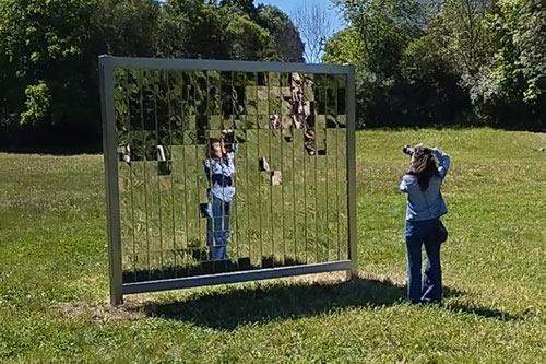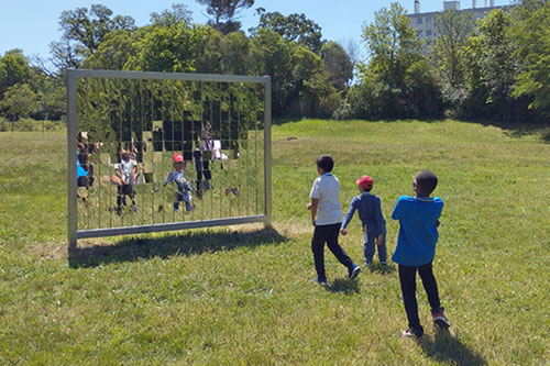 Nous sommes face à un mur miroir mouvant. Sa surface fragmentée de carrés métalliques qui basculent et réverbèrent au souffle du vent, nous entraîne dans un reflet vibrant comme la surface de